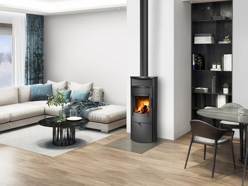 Oválny tvar krbových kachlí LUGO N pôsobí v interiéri útulným dojmom. Príjemnými detailmi sú napríklad odkladací parapet nad ohniskom alebo kľučka dvierok, ktorá svojím technickým riešením aj dizajnom dáva krbovým kachliam elegantný vzhľad.